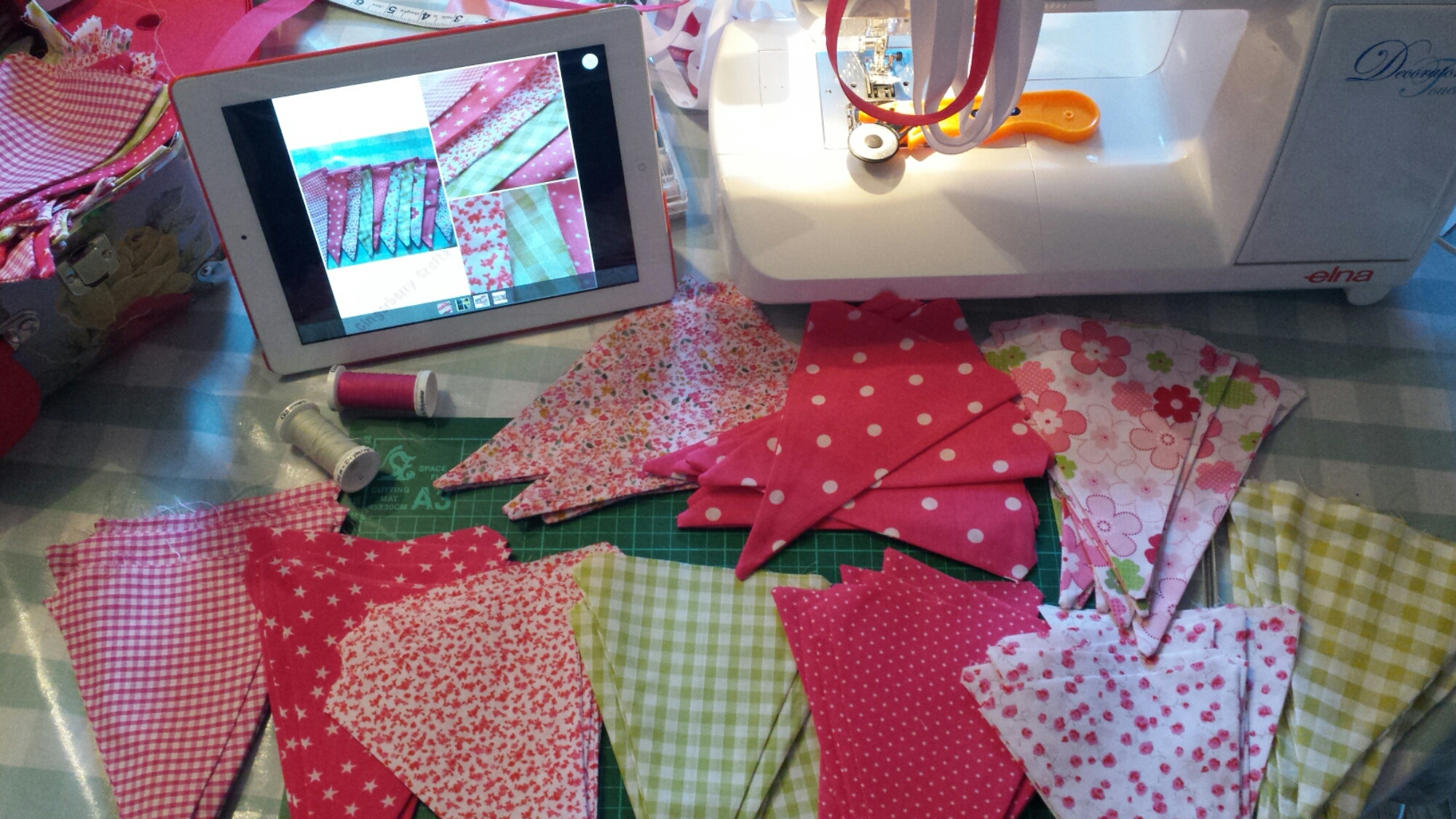 I did the hard work and made a load of bunting triangles the other night, cutting, sewing, turning, pressing…. so just need to trim and stitch onto tape tonight.